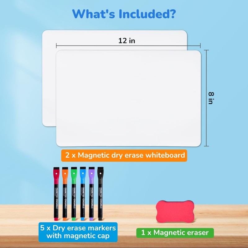 • Included in the Set: 2 Magnetic Small Whiteboards (12" x 8" )+6 Dry Erase Markers+1 Eraser;All components are magnetic and compatible with most refrigerators, including mini, full-size, single-door, and French-door models. The flexible size offers more options for convenience