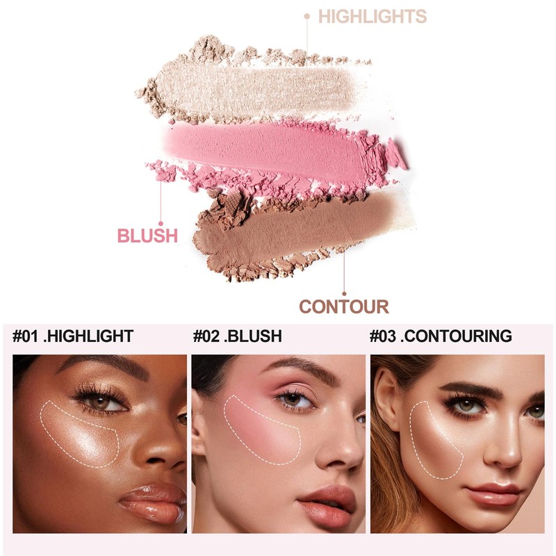 - The product is designed 3 in 1, one palette contains highlighter, contour and blush, and eyeshadow, apply for cheeks, face, and eyes, create a charming combination of light and shadow on your skin.