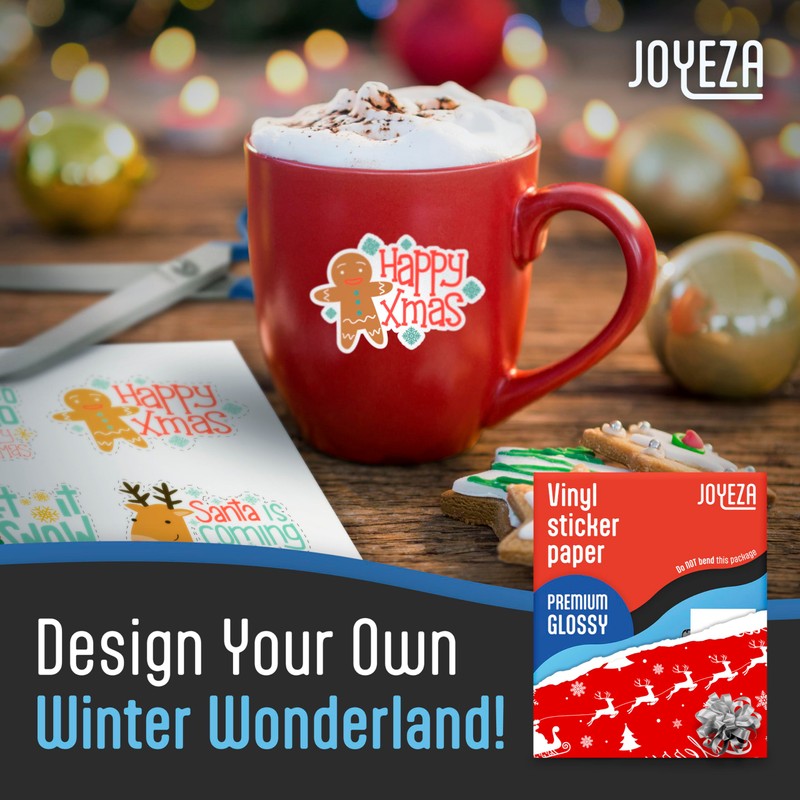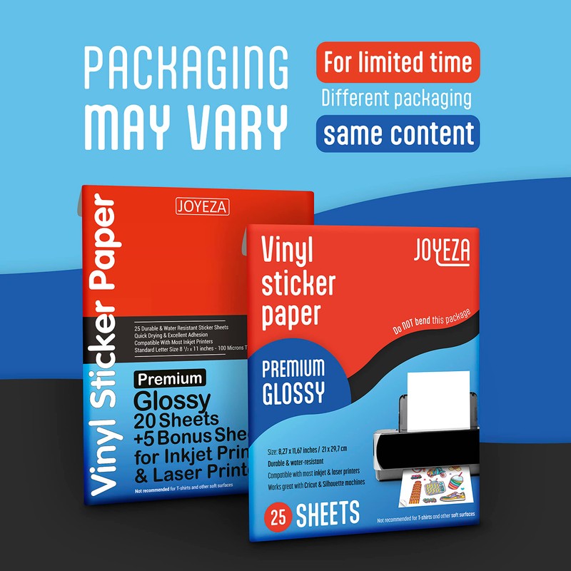 JOYEZA Premium Printable Vinyl Sticker Paper for Inkjet Printer - 25 Sheets Glossy White Waterproof, Dries Quickly Vivid Colors, Holds Ink well - Inkjet & Laser Printer