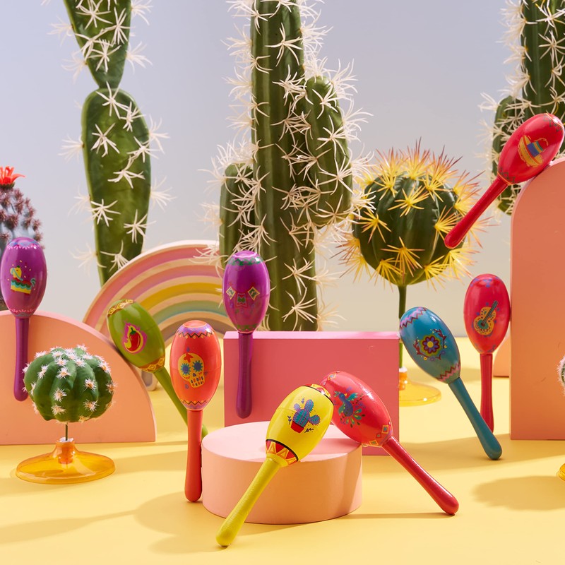 - SUPER VALUE PACK. Our Fiesta Party Favor includes 9 Pcs Mini Noisemaker Wooden Fiesta Maracas with 9 Festive Designs that measures 1.5x5 inches each.