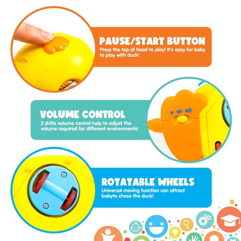 - SUPER FUN AND EDUCATIONAL TOY: Sensory Development – Big colorful buttons and lights encourage baby’s Touch and Exploration, Auditory Learning – Sounds and Songs develop baby’s Listening and Sense of Music and Rhythm. Motor Skills – Duck’s Waddling Movement with Lights attracts baby to Crawl and Chase while the duck’s shape and Boldly-colored buttons help to hone Finger Dexterity.