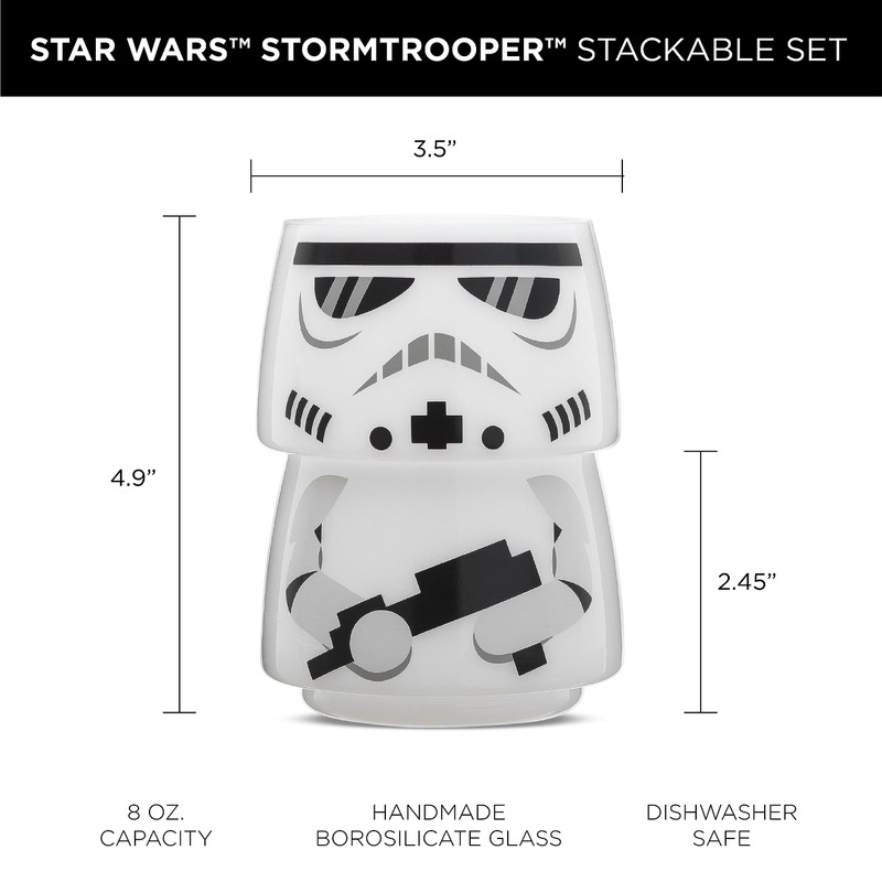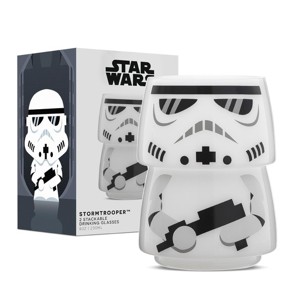 - STACKABLE STORMTROOPER: Uphold the order of the Galactic Empire with this adorable set of 2 stackable glasses. Featuring the loyal Stormtrooper in glass form, stack these 8oz glasses for a charming character display, use each individually, or use one glass cup for drinks and the other for snacks!