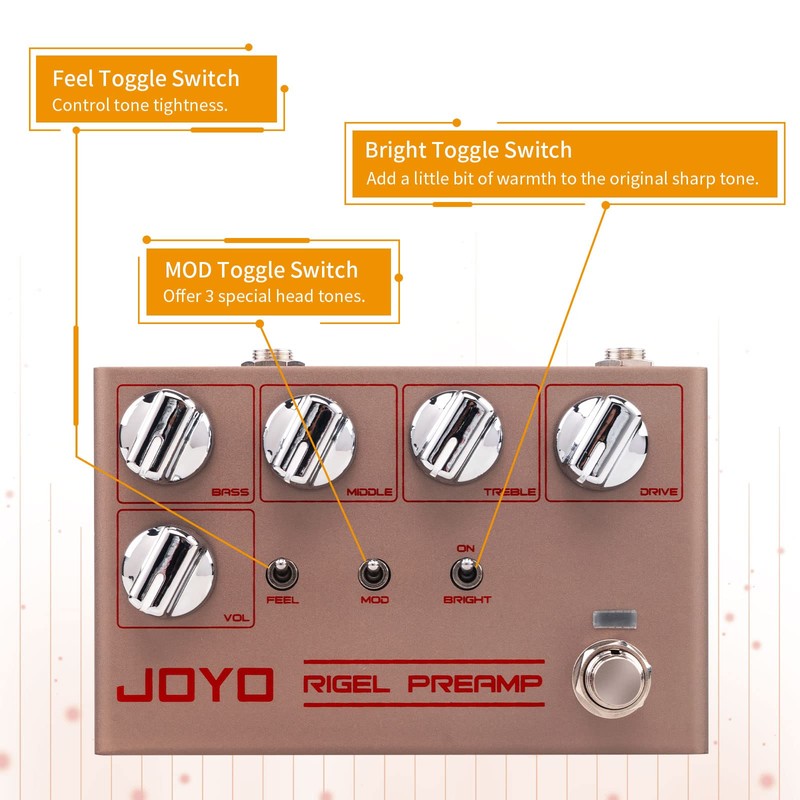 - 3-band EQ,high gain and drive multifunctional control knobs with BRIGHT/FEEL/MOD tone toggle switches.