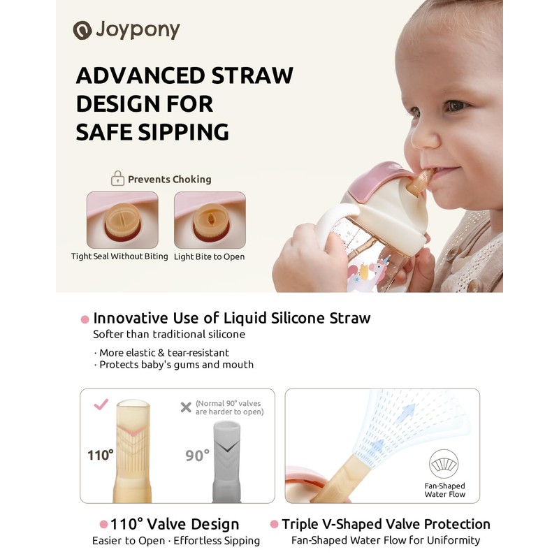 - 【Gentle, Hygienic Straw】The Joypony liquid silicone straw is soft on delicate gums yet sturdy enough for active use. Its V-shaped valve allows smooth water flow, ensuring hassle-free sipping. Each sippy cup includes a replaceable straw for long-term hygiene and safety