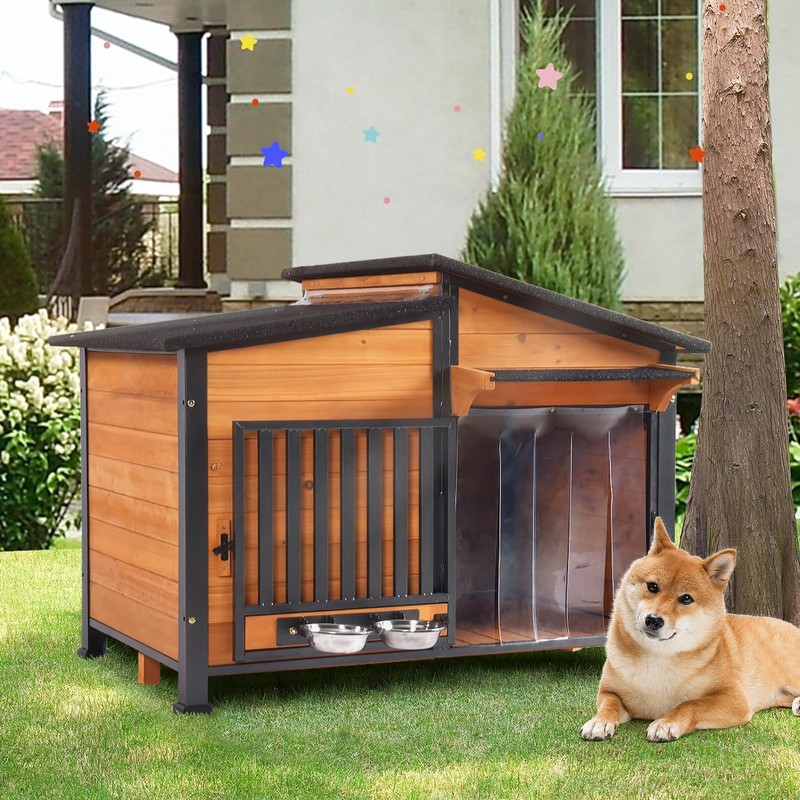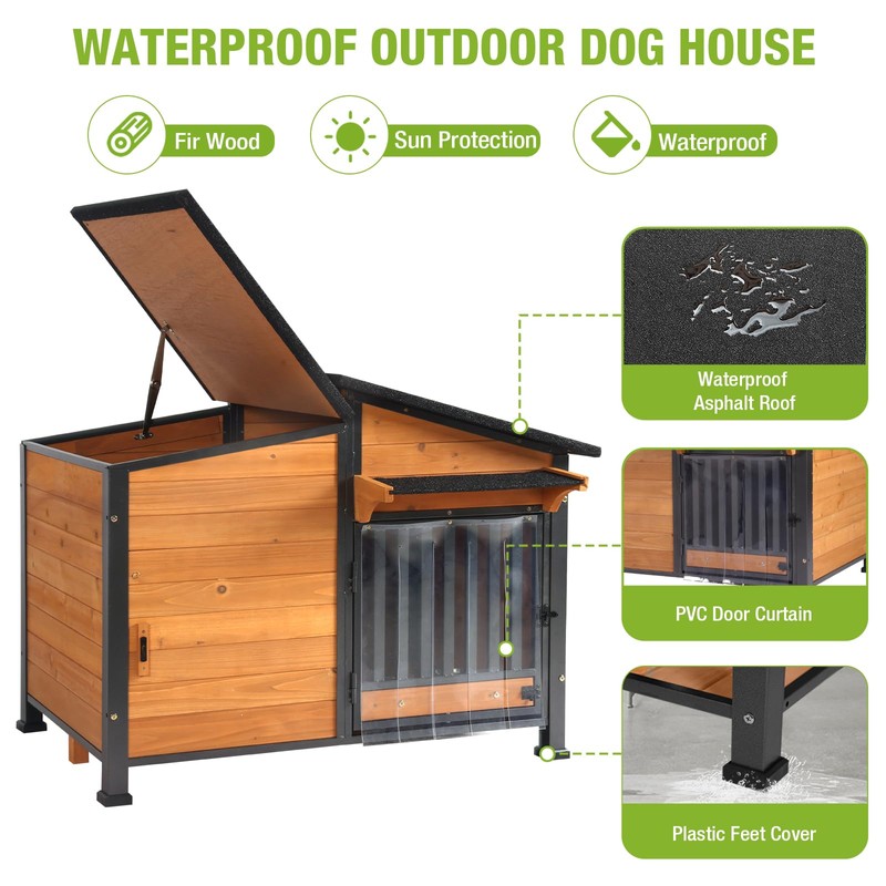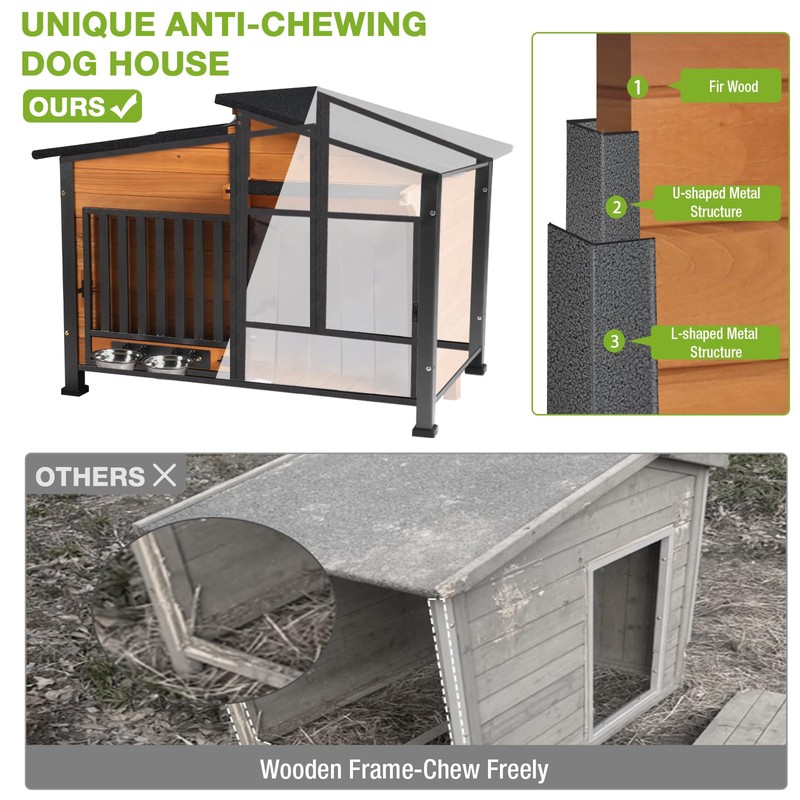 • Durable and Sturdy Structure: Constructed with fir wood and enhanced steel materials, the dog house offers superior chew resistance and durability. Compared to ordinary wooden frames, our dog house is more robust, capable of withstanding your pet's chewing, and lasts longer.