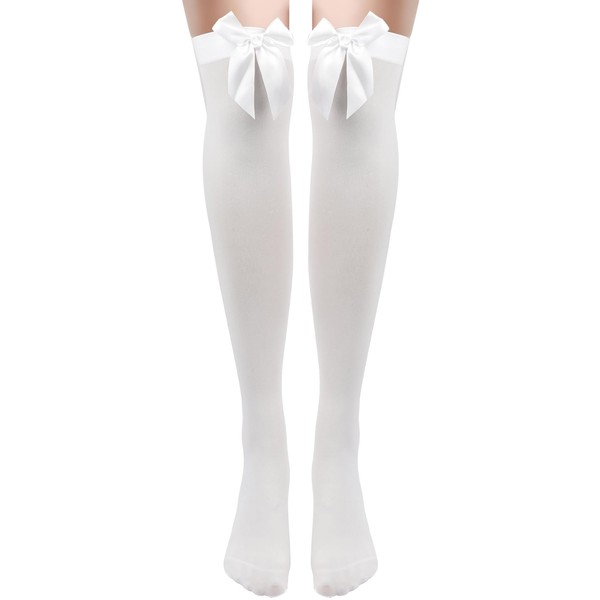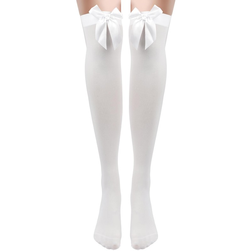 JoyrnalK White Thigh High Stockings - Opaque Over Knee Socks With Bows