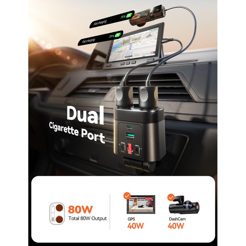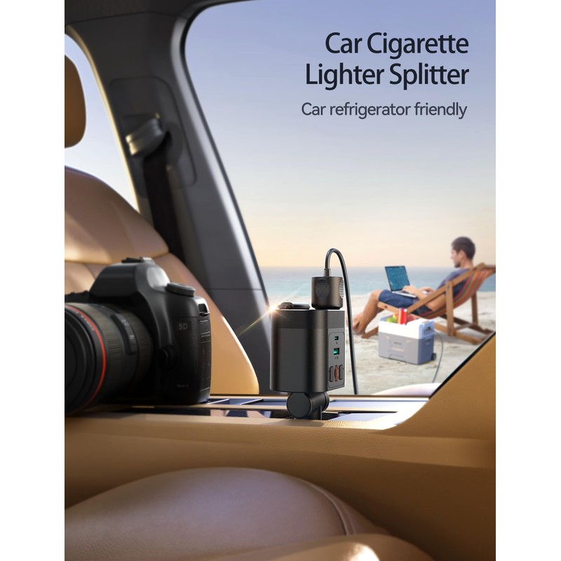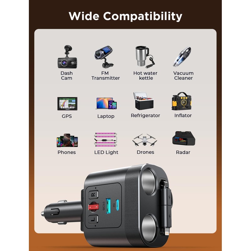 - 1 cigarette port expanded to 5 charging ports, features USB-C, USB-A, retractable cable, and 2 cigarette portsperfect for multi-device users and clutter-free car interiors