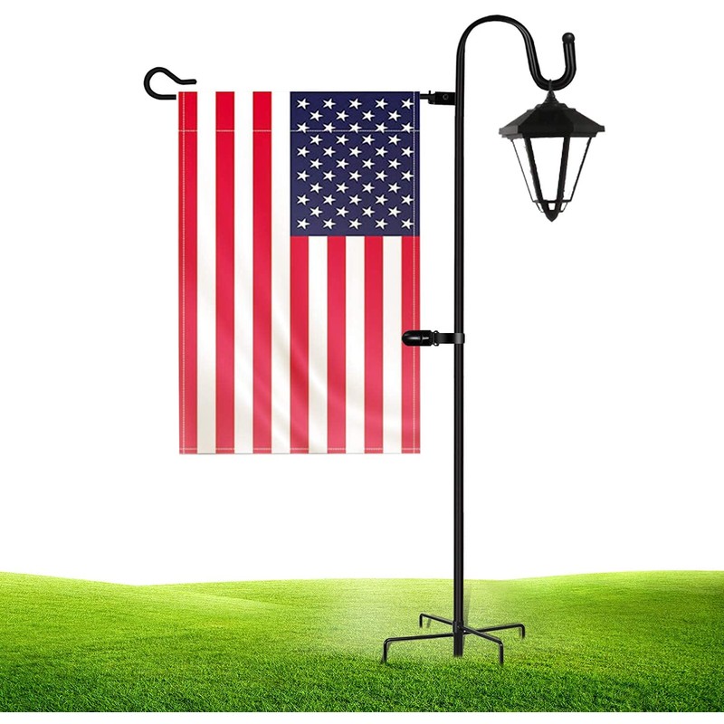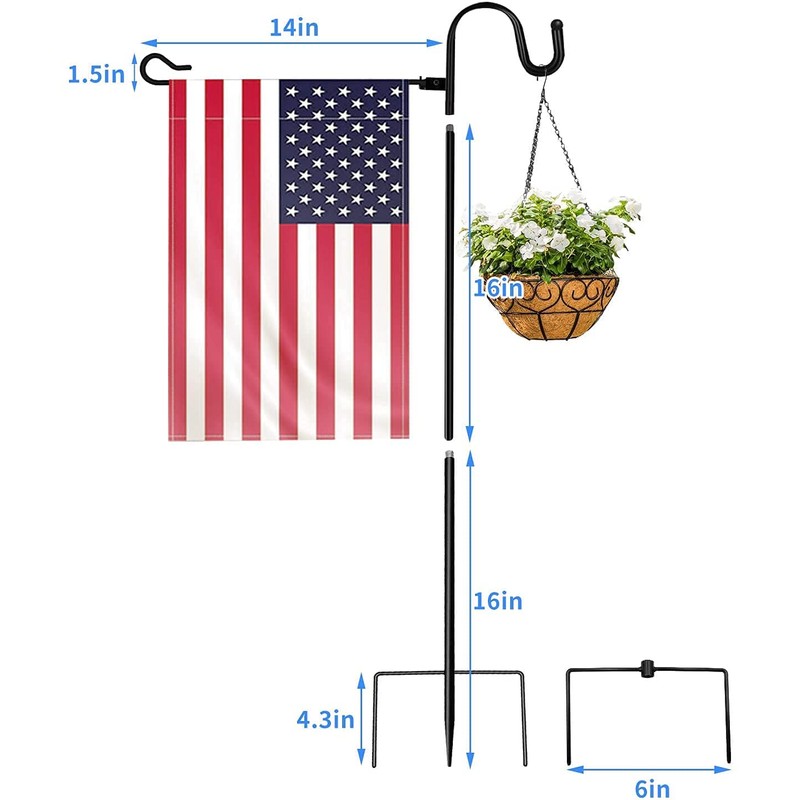 - 【Durable】The yard flag stand with a 1/2 inch diameter one piece wrought iron metal, much thicker than other brand 1/5 inch garden flag stands, makes you have the strongest and thickest garden flag poles for hanging bird feeder or flags, just bring your heavy flower pot basket or bird feeders.