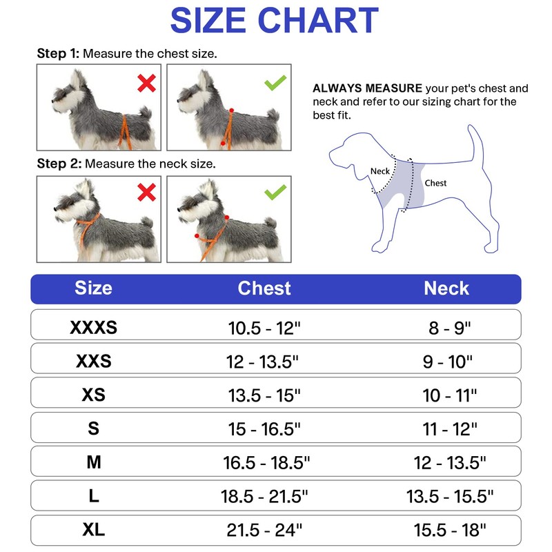 - Size Guide: It is highly recommended to measure the widest part of your pet's chest and neck and refer the size chart before placing an order. Avoid choosing the size by weight alone. It is ideal for extra-small, small, and medium breeds