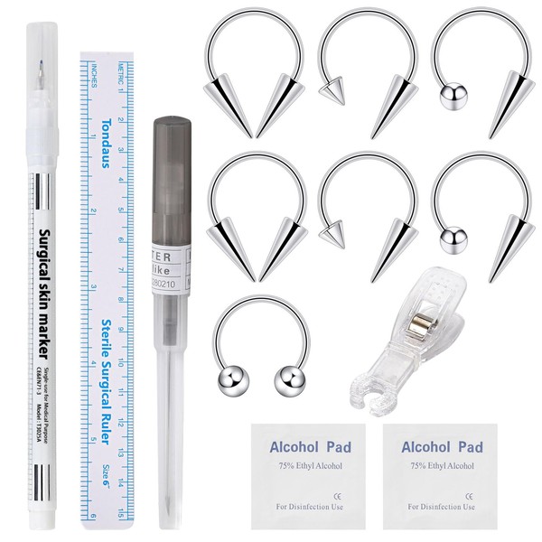 - You will receive a piercing kit containing 1pc catheter disposable piercing needle +7pc stainless steel nose rings +1pc marker +1pc positioning clip +2pc alcohol cotton pieces.