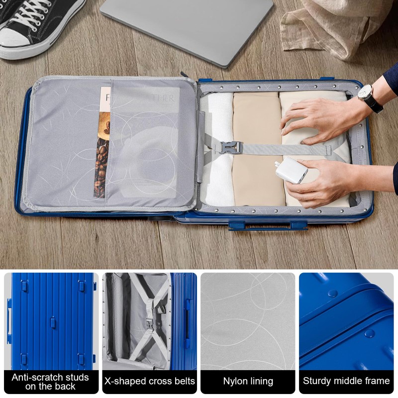 - Meticulous Storage: The interior of the hard case carry on luggage is equipped with X-shaped cross belts, which can effectively fix the luggage and avoid clutter of items. At the same time, the front opening cover of the luggage suitcase contains multiple storage pockets. The reasonable interior layout makes your storage more effortless and efficient