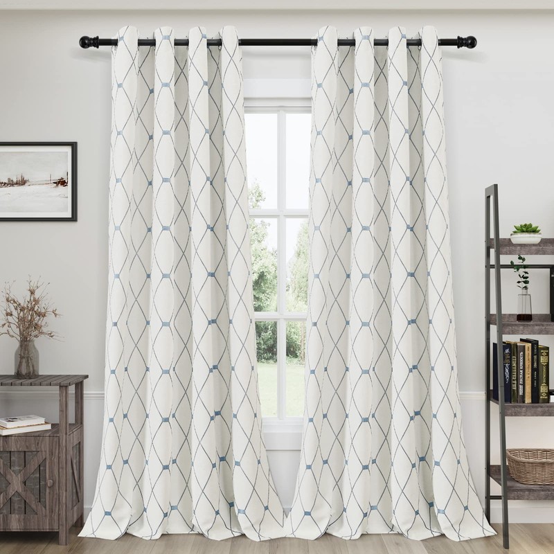Joywell Linen Textured Living Room Curtains 96 inches Long Embroidered Farmhouse Window Curtain Neutral Grommet Curtain 2 Panels Thick Cotton Curtains Blue Checkered Pattern 8ft Tall