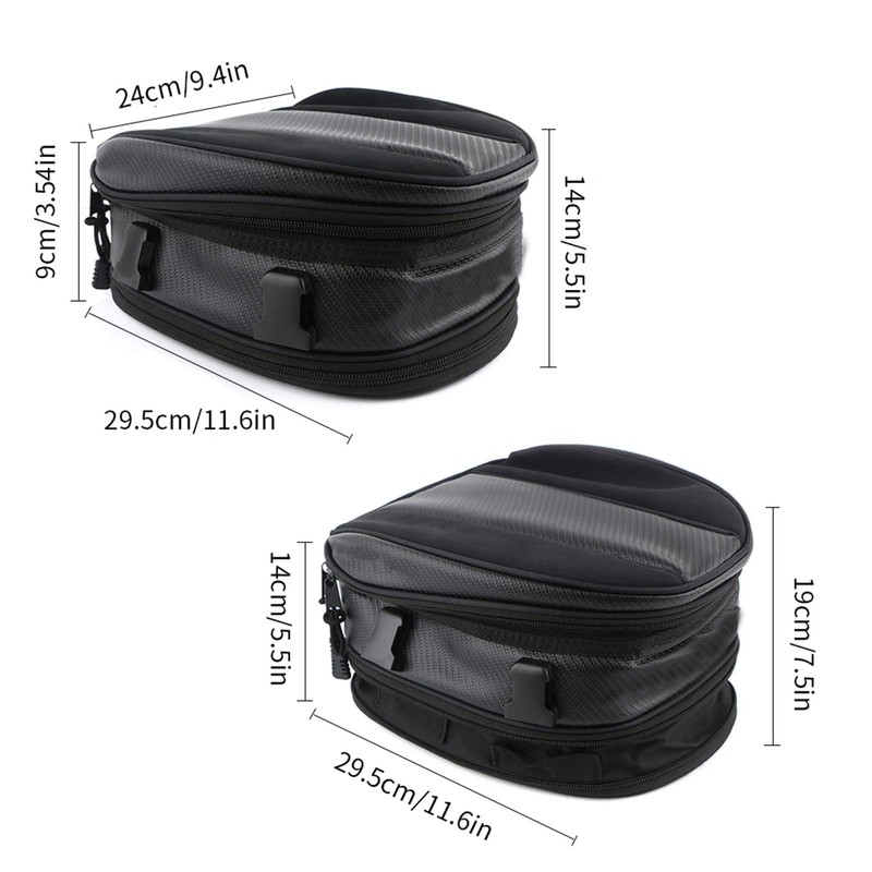 - 10L Capacity: A classic look and all the features you could ever want, waterproof luggage motorbike saddle bags, a good item to store your helmet,wallet, phone, camera, energy drinks, cigarette, motorcycle tail bag backpack also features a expandable bottom section to enlarge storage space