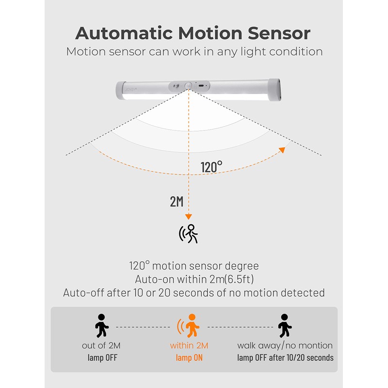 - Motion Sensor Light: The light has the basic on/ off selection, so turn the light on or off just by switching to the on/off mode. It also has 10s/20s motion sensor mode. When you switch to 10s/20s, the light will turn on when the unit detects motion within a 2m range. It will automatically turn off after 10-seconds/20-seconds of inactivity. You can just choose the mode you want to use.