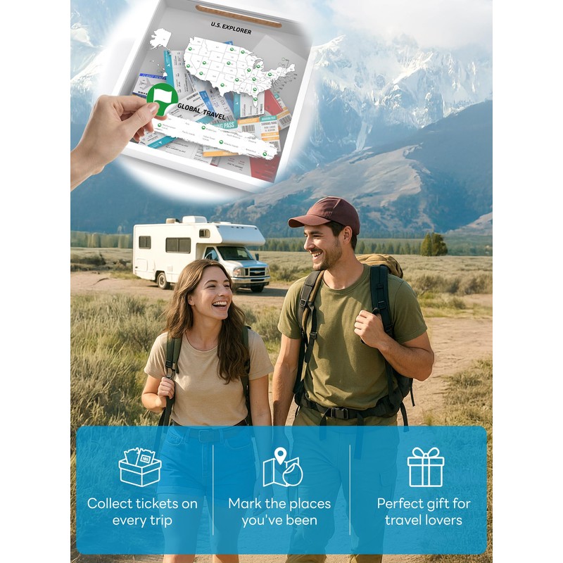 - TRACK YOUR ADVENTURES & SHARE STORIES: Comes with a US map for travel tracking and world destinations, includes 100 round check-in stickers, allowing you to mark the places you've visited with ease. A fun and interactive way to relive your journeys—whether reminiscing solo or share with family and friends