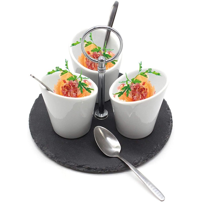 JPH Tapas Dishes Platter Appetizer Dips Serving Set Ceramic Nibble Cups Slate Disk Stainless Steel Spoons