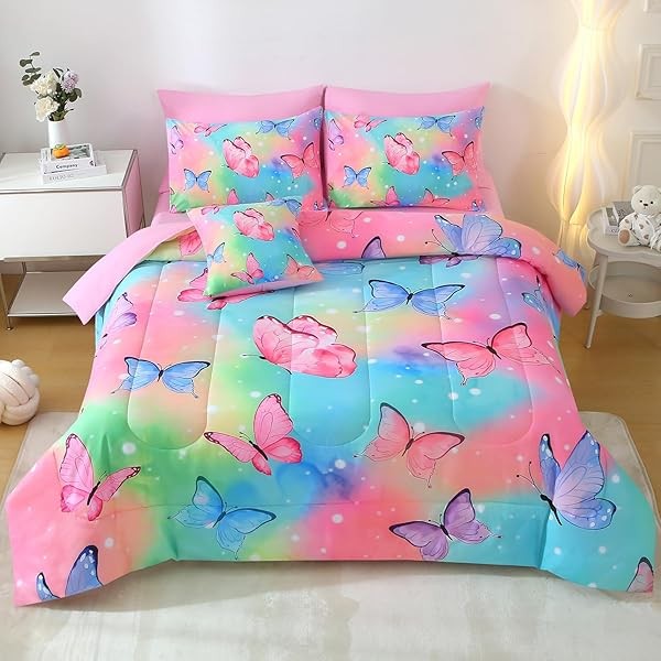 JQinHome 6 Pc Twin Rainbow Butterfly Comforter Set - Microfiber Butterfly Design Bedding Collection with Pillowcase, Flat & Fitted Sheet