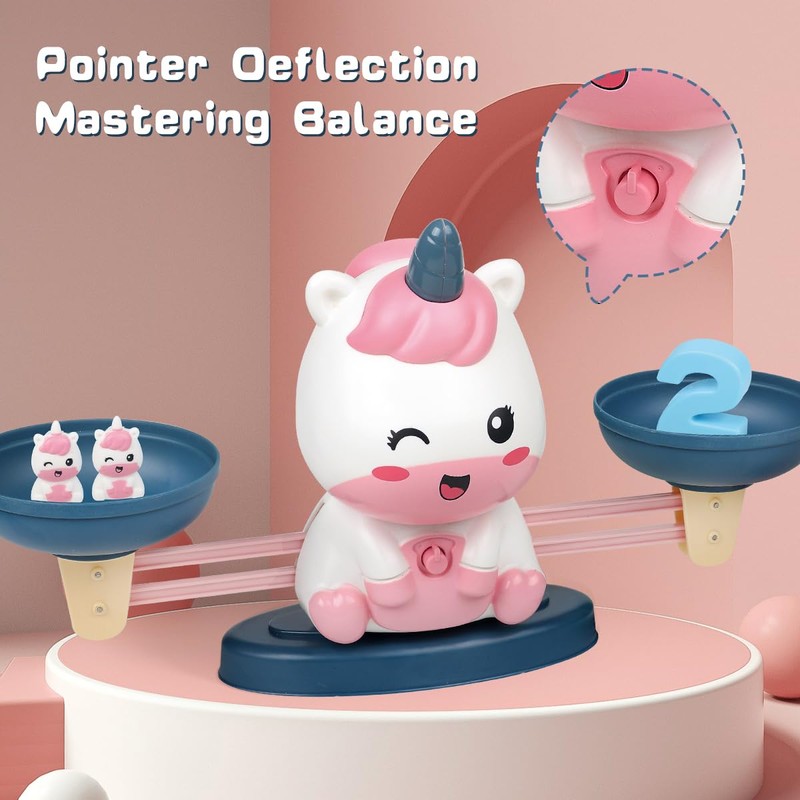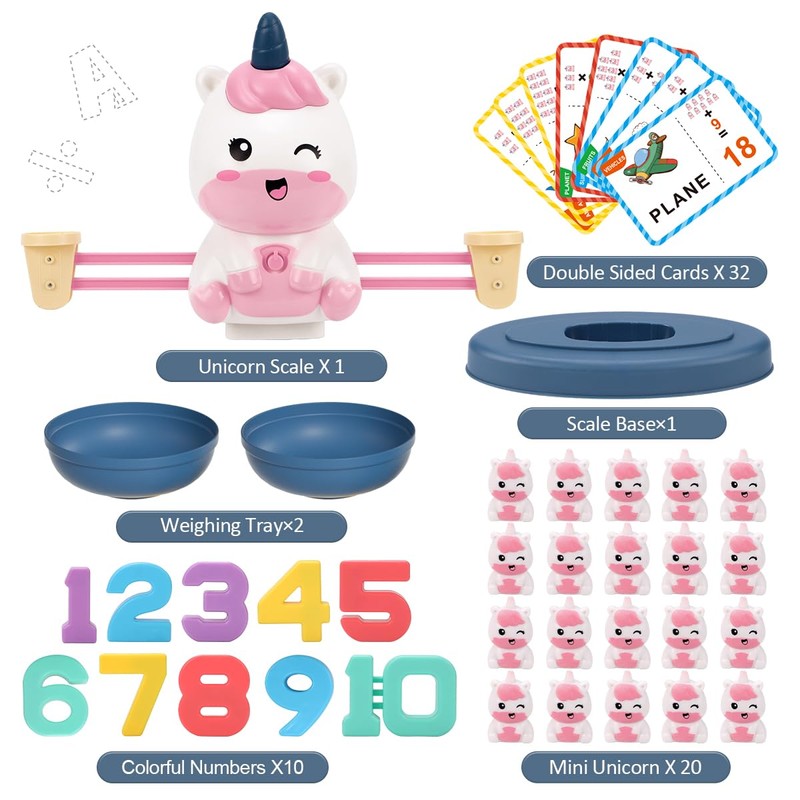 - [66-IN-1 Unicorn Toys ] The 66 PCS girl toys includes: 1 unicorn balance toy, 1 scale base, 2 weighing tray, 10 colorful numbers 1-10, 20 mini counting unicorn, 32 double sided cards. Easy to install and play for boys girls.
