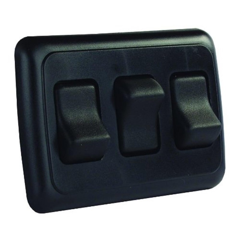 On/Off Rocker Switch Assemblies - Black-Triple-12V interior switches can be used for various applications. Designed with a large switch button for easier use and the bezel assembly will look great in any application. 16 AMP @ 125-250 VAC, 3/4 HP, 10 AMP @ 14 VDC. UL/CSA/VDE approved. Pack of 1.F E A T U R E S- Single Cut Out Dim. = 1.25 x 1.625 Double Cut Out Dim. = 2.437 x 1.625 Triple Cut Out Dim. = 3.625 x 1.625