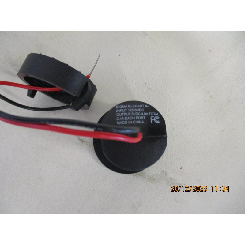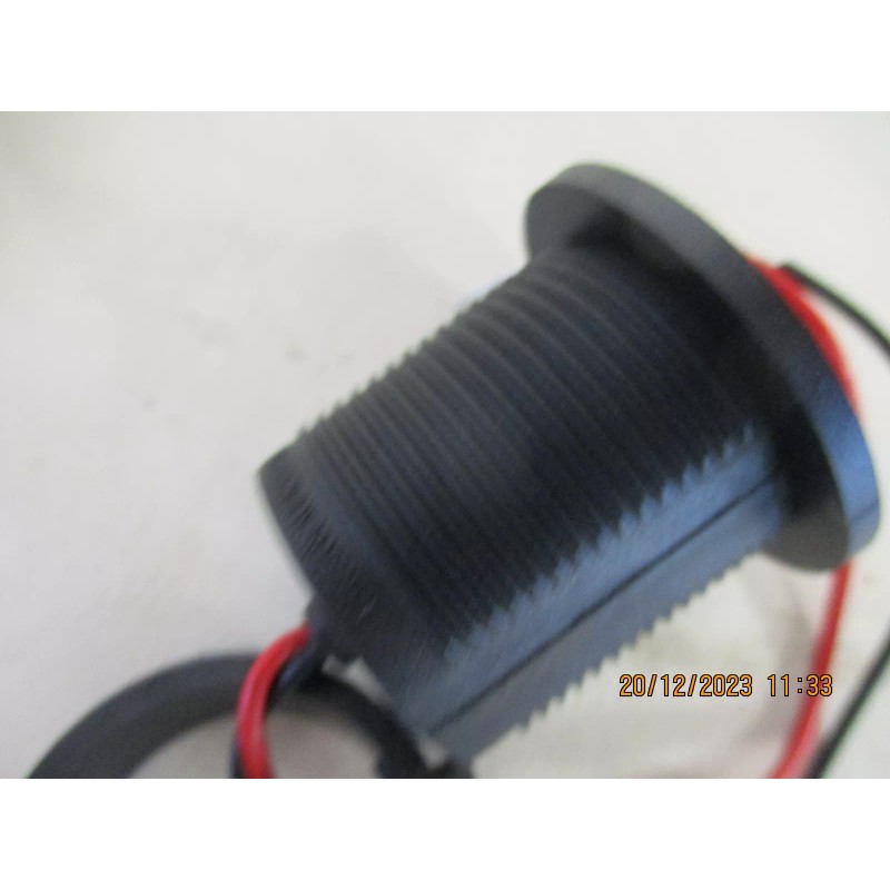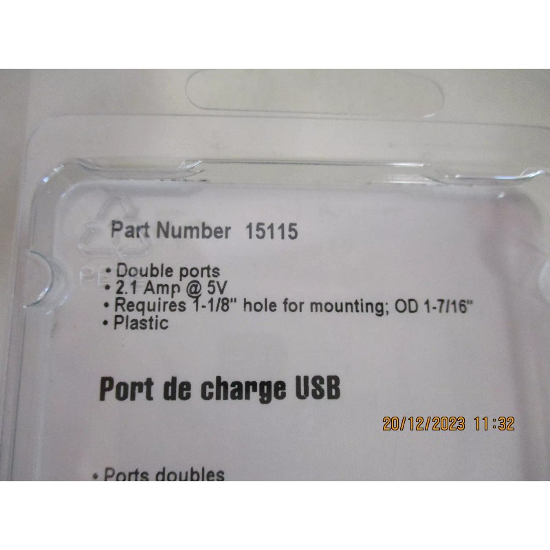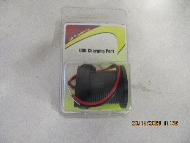 I am selling JR Products USB charging port black, part # 15115. This item is new in original packaging, comes as shown. It roughly measures 1 1/8" ID x 1 7/16" OD. It has double ports, 2.1 amp @ 5v, black plastic, (1) threaded mounting, (1) red wire, (1) black wire. For more information regarding this item contact a dealer in your area. (TMS / 181 B / 9101552) / LH