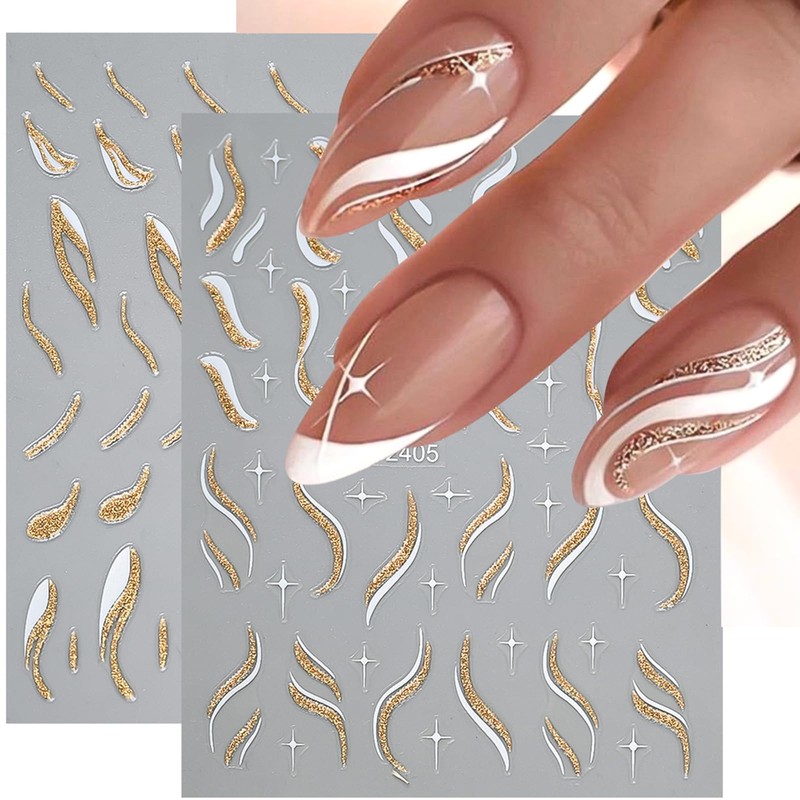 Jremg French Nail Art Stickers 3D Self-Adhesive Gold Glitter Design Waves Lines Nail Decals Gold White Glitter French Lines Nail Art Supplies for Women Girls Nail Tips DIY Manicure Decoration 6 Sheets