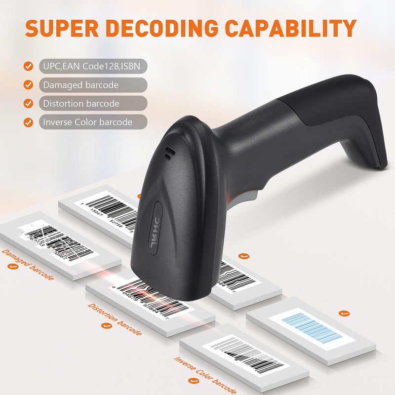 - 【Sturdy Anti-shock and Durable Design】2d scanner has Ergonomic design with high-quality ABS making it can support withstand repeated drops from 1.5m high to the concrete ground, durable to use. high-speed USB cable, the wired barcode scanner lets you scan with more flexibility, transfer data with speed and ease.