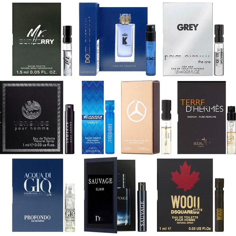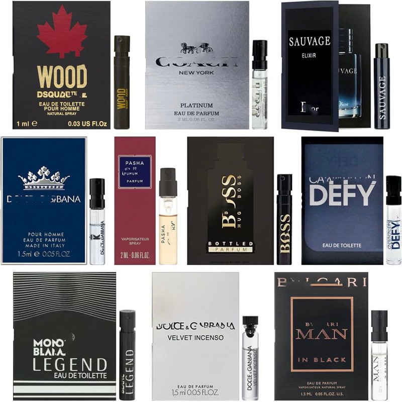- Lot of 10 popular name brand fragrance sample vials for men. Each sample size is between 0.02 to 0.05 ounces.