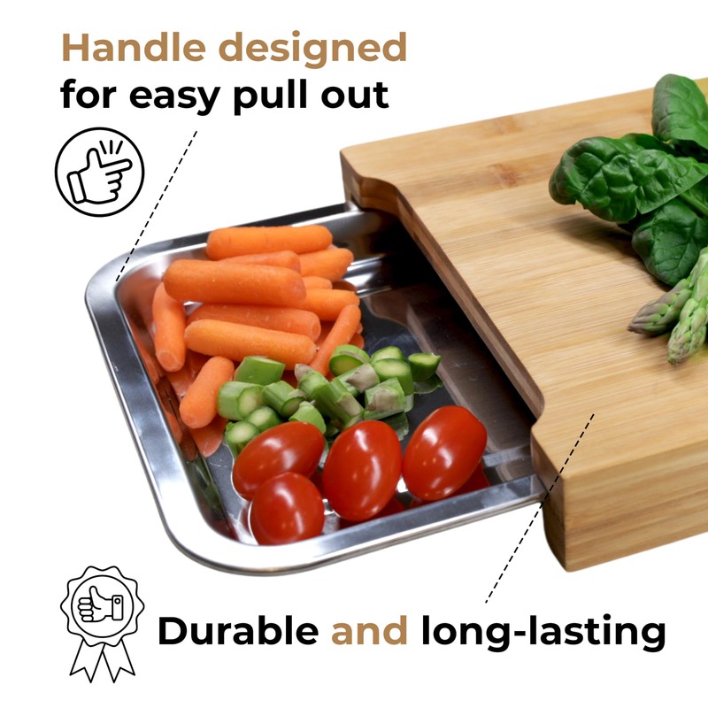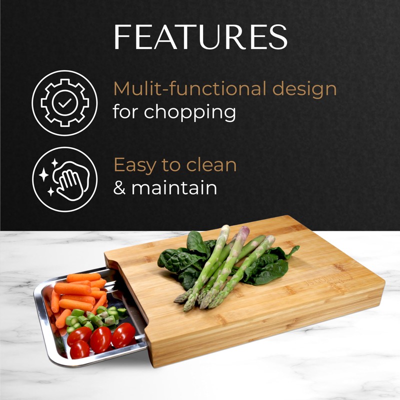 JS Gourmet Bamboo Chopping Board with Non Stick Pullout Stainless Steel Tray, Elevate you Kitchen Experience with Versatile Cutting Board for Cutting, Chopping and Carving