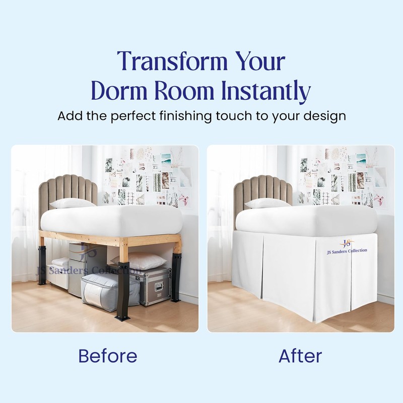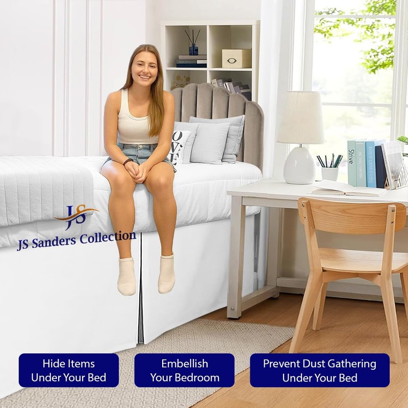 JS Sanders Collection Pleated Dorm Size Bed Skirt - 100% Cotton Blend Fabric Dorm Bed Skirt White - Twin XL Size College Dorm Bed 30" Drop (White, 30" Drop)