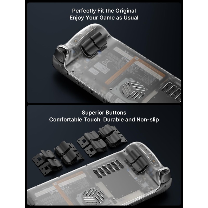 - Customize Your Steam Deck: The transparent cover also comes bundled with three sets of rear buttons (each one with a different height:original, high and low) that will let DIY enthusiasts make their Decks even more unique. Each button has a more durable, anti-slip, premium texture