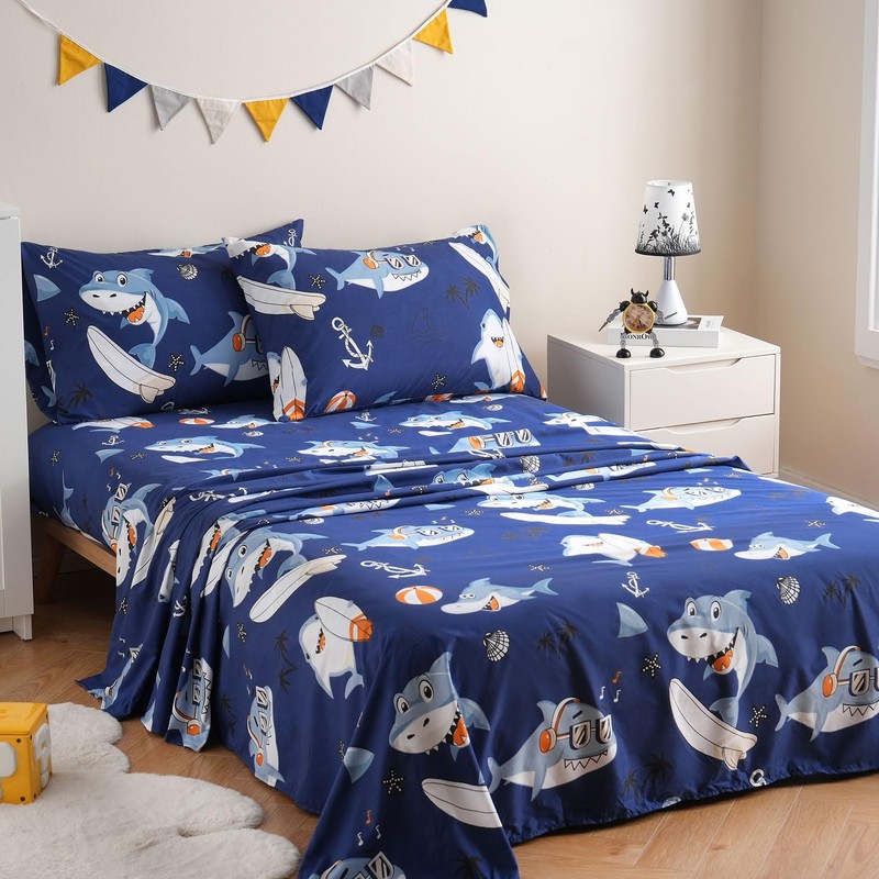 JSD Blue Shark Surfing Kids Sheet Set Full Size, 4 Piece Nautical Printed Microfiber Sheets Deep Pocket