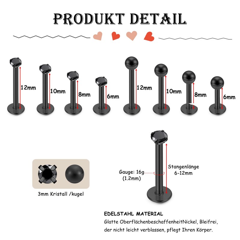 - 【Size】Gauge: 16G (1.2mm), Bar Length: 6mm/8mm/10mm/12mm, Crystal/Ball Size: 3mm. The most popular sizes for lip, tragus, labret, medusa, forward helix, ear and body piercings