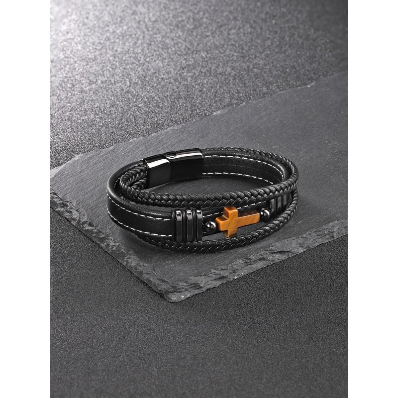 JSDDE Tiger's Eye Cross Leather Bracelet for Men Braided Leather Bracelet Men's Bracelet Leather Band Pearl Bracelet for Men, One size, Leather Stainless Steel Leather Tiger's Eye Stainless steel