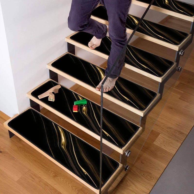 JSDGFYTIER Marble Texture Wall Surface Black Gold Ink Graphic Granite Abstract Stair Treads Carpet Runners Non Slip Self Adhesive Safety 30inx8inx0.3in-13PCS