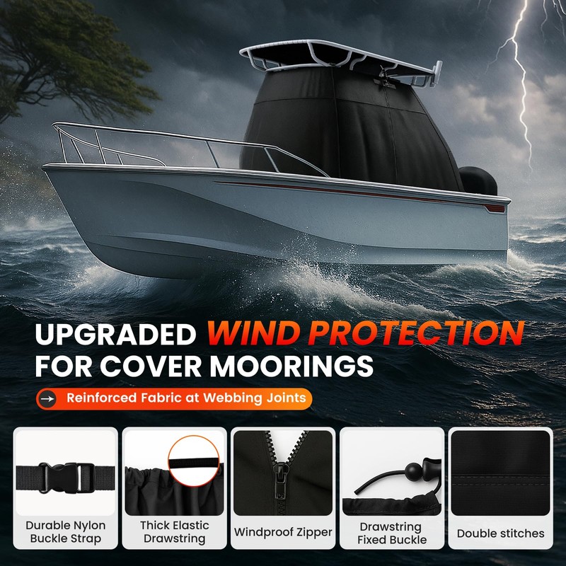 - Easy and Safe Installation: The top and bottom of the t top center console boat cover are made of thickened elastic drawstrings, and the tail of the drawstring is equipped with a tether lock, which can better fix the tether length and fit better. It is very convenient to install and remove when the ship is moored.