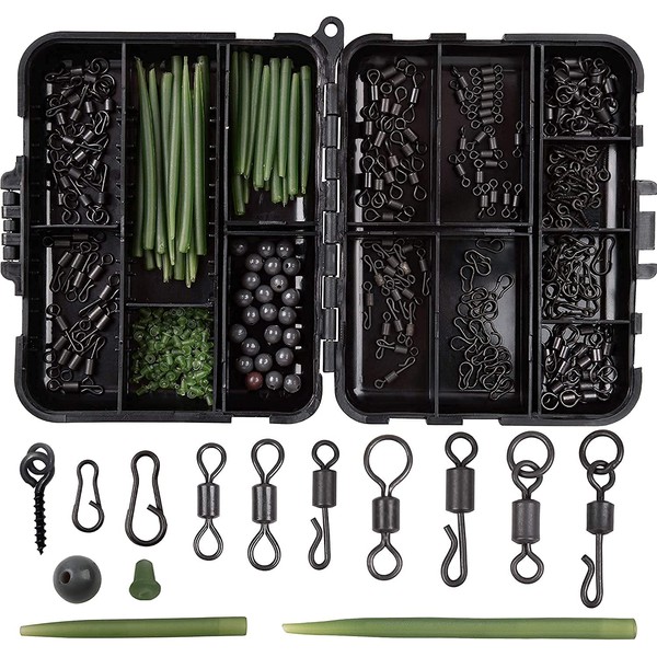 • 300pcs carp fishing swivel set include 14 sizes carp swivels, hook stops, beads, bait screws, anti-tangel sleeves. Great for carp coarse sea fishing.