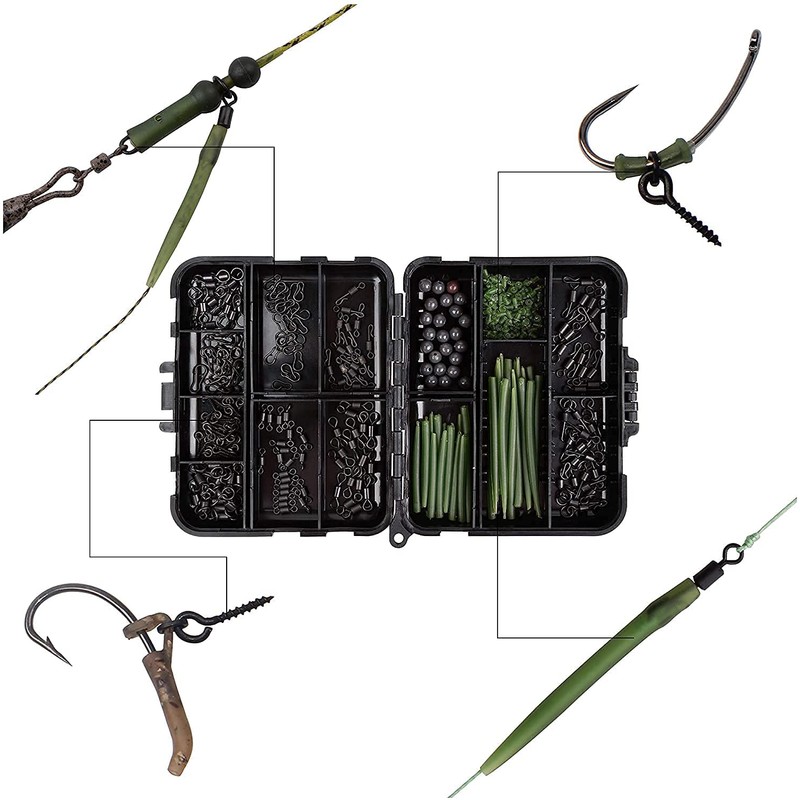 300pcs carp fishing swivel set include 14 sizes carp swivels, hook stops, beads, bait screws, anti-tangel sleeves. Great for carp coarse sea fishing.