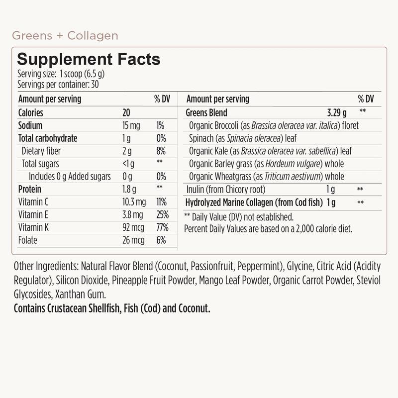 - Ingredients: Greens Blend (Organic Broccoli floret,Spinach leaf,Organic Kale leaf,Organic Barley grass,Organic Wheatgrass) 50.7%,Hydrolysed Marine Collagen (Fish) 15.4%,Inulin (from Chicory root),flavor blend (Coconut,natural Passionfruit,Peppermint oil),Glycine,Acidity regulator (Citric acid),Colloidal anhydrous silica,Pineapple fruit powder,Mango leaf powder,Organic Carrot powder,Sweetener (Steviol glycosides),Thickener (Xanthan gum). Contains Fish.