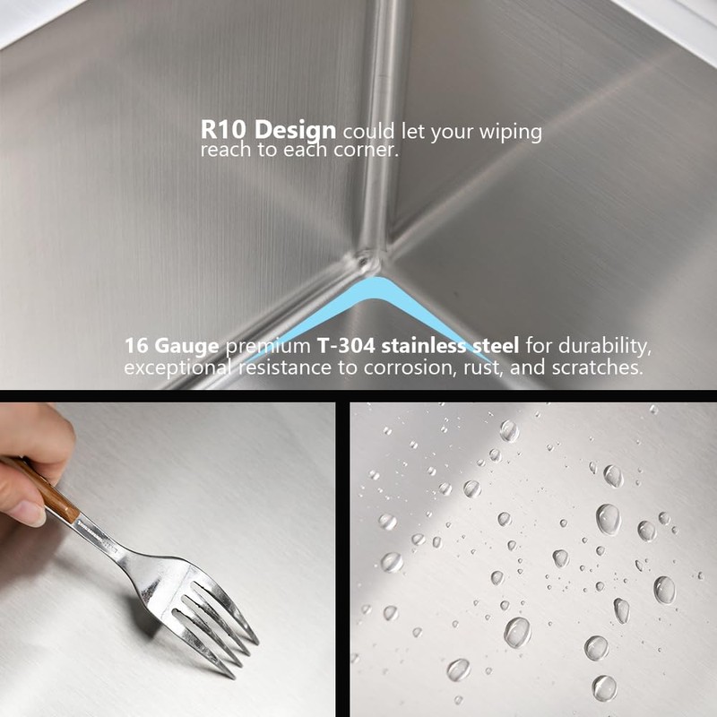 This 18 inch drop in kitchen sink is constructed of 16 Gauge SUS304 stainless steel for superior strength and durability.