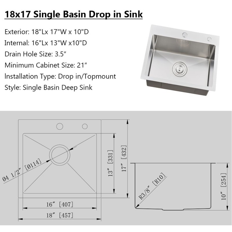 - Sink Dimensions: External size 18"(L)x 17"(W) x 10"(D), minimum Cabinet Size: 21", internal size 16"(L)x 13"(W)x 10"(D), standard 3.5-inch drain opening, please make sure it fits your kitchen countertop before purchasing.