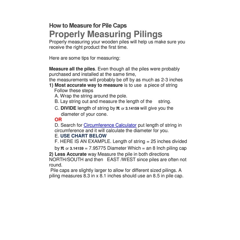 - IMPORTANT: Please measure using the circumference method of each individual piling ~ Please DO NOT measure 1 and assume they all have the same dimensions, each one must be measured to ensure the correct cap is fitted to each piling. ~ Note: Pilings are not completely round and they do not all have the exact same measurements ~ See our Guides on how to measure properly by downloading the guides from our images or at https://images-na.ssl-images-amazon.com/images/I/61pvP9Kud0L.pdf