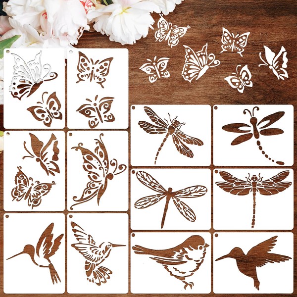 JSRQT 12Pcs Spring Stencils for Painting on Wood Craft Canvas Walls,Hummingbird Butterfly Dragonfly Drawing Template, Reusable DIY Home Decor Craft Stencil,5.6 x 4.1”