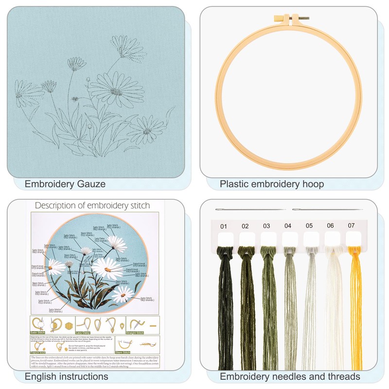 - Package Includes: 1*cotton embroidery cloth, 1*embroidery hoop, 1*English instruction, 2*embroidery needles, enough embroidery threads