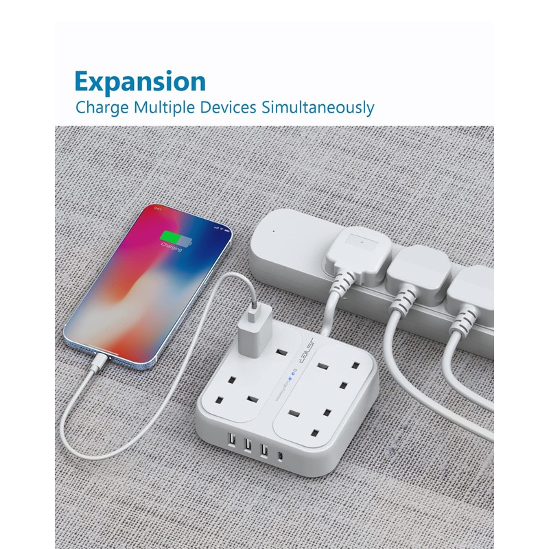 JSVER Plug Extension USB,Extension Lead with 4 USB Slots(3 USBA+1 USB C) Power Socket with 4 Way 4 USB Charging Station(17W) Power Strip Surge Protection for Home Travel,White