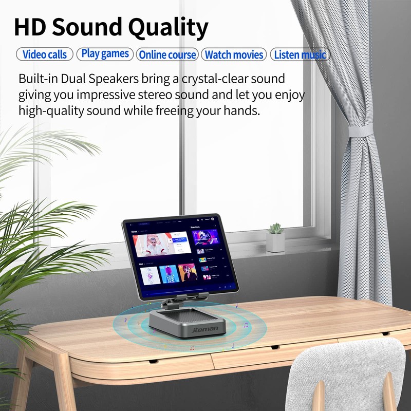 - 【Higher Quality Louder Volume】Jteman Bluetooth Speakers with Tablet Stand,Built-in Dual Speakers let the Volume more louder but not noisy,giving you impressive stereo sound when you enjoying music and movie.Tablet Stand built-in microphone design for hands-free calling,can take a clear sound from the speake