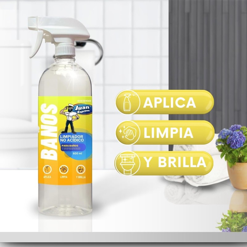 - Juan Capitán Limpiador no-acidico diseñado para substituir el uso en la limpieza diaria de sanitarios y otras superficies del cuarto de baño, de los comúnmente usados productos a base de ácidos agresivos, tóxicos y perjudiciales para personas y superficies