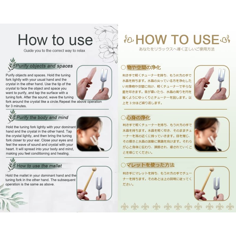 - Tuning Fork - Super Value Five piece set : Contains Crystal Tuning Fork, Natural Crystal, Natural Crystal Particles for purification, Small wooden hammer and Storage Bag.