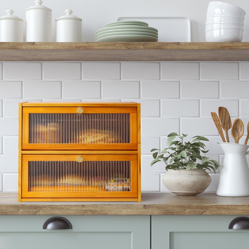 - 【 Fashionable Appearance 】: The bread box door and window are embedded with frosted acrylic glass, making the entire pine wooden breadbox look more fashionable and beautiful. You don't need to frequently open the door and window,keeping food clean and fresh.Acrylic's durability and resistance to wear and tear also reduce the risk of injuries caused by breakage, making it more environmentally friendly and safe than ordinary metal and plastic bread containers.