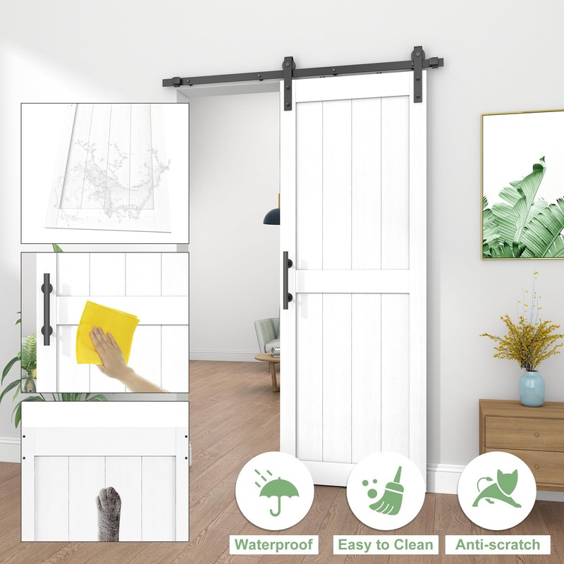 - Waterproof and Scratch-proof: PVC surface makes the barn door scratch-proof and waterproof. Meanwhile, it is easy to clean. It extends the service life of the white barn door to the greatest extent and is also very suitable for families with pets.