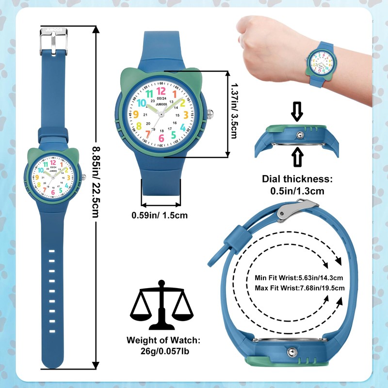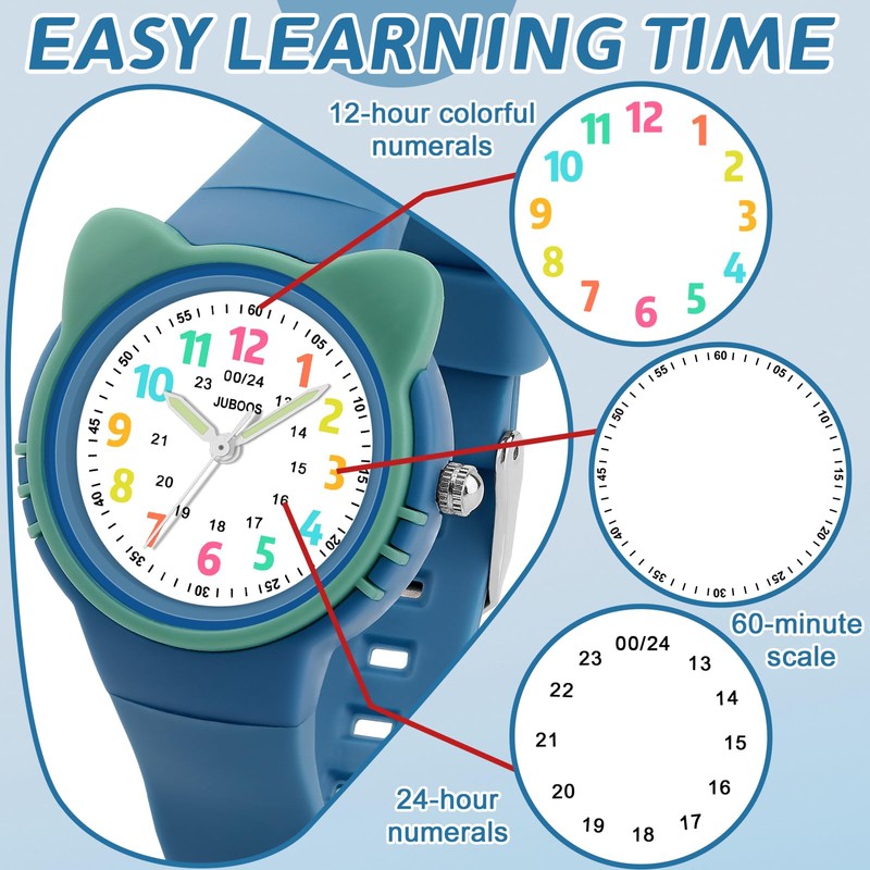 - 【Children's first pointer watch】Juboos has designed a children's learning watch with fashion and childlike fun. The cute cat ears are matched with simple numbers, and the colors are clear and rich, allowing children to easily learn time